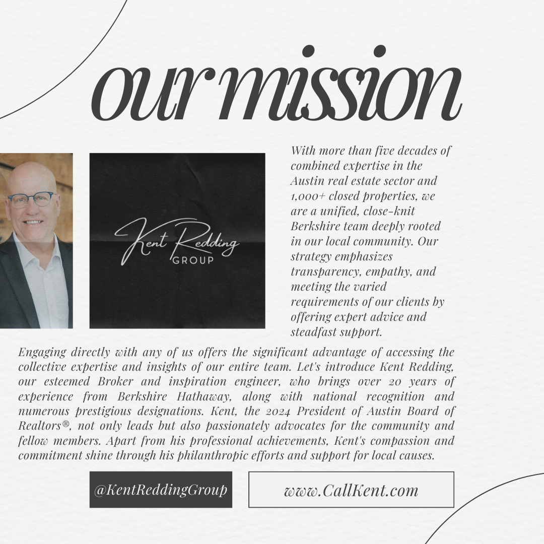 Engaging directly with any of us offers the significant advantage of accessing the collective expertise and insights of our entire team. Let's introduce Kent Redding, our esteemed Broker and inspiration engineer, who brings over 20 years of experience from Berkshire Hathaway, along with national recognition and numerous prestigious designations. Kent, the 2024 President of Austin Board of Realtors®, not only leads but also passionately advocates for the community and fellow members. Apart from his professional achievements, Kent's compassion and commitment shine through his philanthropic efforts and support for local causes.