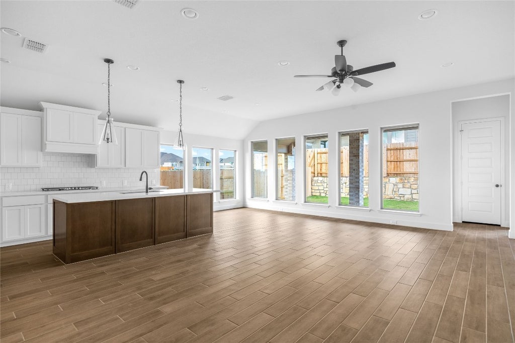The largest single-story design built on a 50' lot by Perry Homes in this community and the only one available for immediate move-in is ready to welcome you home. Step into the spacious main living area, where a wall of windows fills the open family room with natural light. The space flows effortlessly into the dining area and the corner kitchen, complete with an oversized island with bar seating, a 5-burner gas cooktop, and a walk-in pantry, perfect for everyday living and entertaining. Tucked at the back of the home, the primary suite is a private retreat featuring three large windows and a spa-inspired bathroom behind French doors. Enjoy dual vanities, a garden tub, a glass, enclosed shower, and two large walk-in closets. Off the main hallway, you'll find a guest suite with its own walk-in closet and private full bathroom—ideal for visitors or multigenerational living. At the front of the home, French doors open to a dedicated home office, perfect for working remotely or managing daily tasks. Two additional secondary bedrooms, each with walk-in closets, share a full bathroom down a separate hallway. A spacious game room with three large windows offers the perfect place to relax or entertain, and the nearby utility room includes built-in linen storage for added convenience. Outside, enjoy an extended covered patio, ideal for year round outdoor living. A two-car garage completes the home. Don’t miss this rare opportunity to own Perry Homes most spacious single-story design, move-in ready today!