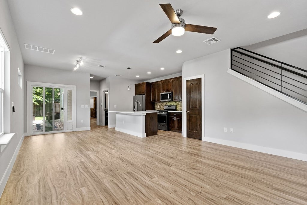 Modern open concept layout with three master suites - perfect for roommates! Large kitchen island with double oven gas stove and walk-in pantry. Primary bedroom on main floor with en-suite bathroom and walk-in closet. Upstairs has a flex space, and two bedrooms with ensuite bathrooms. Fenced backyard and pet friendly. This property is walking distance to Govalle Park trail and pool and is less than 5 minutes from Austin Bouldering, Bambino, and Springdale General. Plus, you'll be conveniently near downtown Austin and the airport.