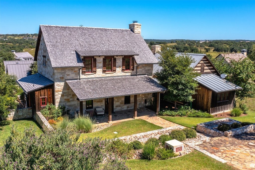 Historically inspired Overlook Cabins at Boot Ranch reflect the massing and materials found in 19th-century Fredericksburg residences. The two-story main gathering house has generous front and back limestone porches as well as a limestone fireplace within the two-story great room. Its native stone façade is complemented by the stone framework defining the dining room entrance. The rustic finish of the dining area is true to the construction techniques of early Fredericksburg, with wood walls and ceiling beams. The open kitchen features premium appliances including a dual-fuel range with a 6-burner gas cooktop, farmhouse sink, and microwave drawer. Nearby is a pantry, powder room, and large laundry room. The primary bedroom suite features rustic log walls, a cathedral ceiling with beams, and a stone fireplace with gas logs. The bathroom features his and her vanities, a generous shower, and a free-standing tub. A detached cottage features two guest suites, each with a private entrance. The detached barn is a 2-car garage with a storage room accessible from the outside staircase. Close to the Putting Park, Driving Range, Ranch Club, Clubhouse Village, and Metzger Market Home offers wonderful flow for parties and exceptional private accommodations for guests Don't miss your opportunity to become part of Boot Ranch, the finest private club community in Texas.