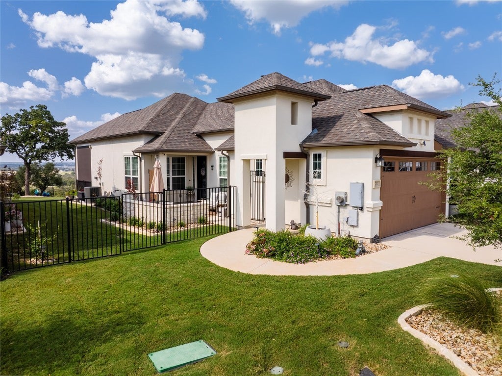 Enjoy the comfort and security of a true lock-and-leave lifestyle—perched on a hilltop within one of the area’s most sought-after communities, and showcasing million-dollar Hill Country views! This custom Sitterle home blends stylish, high-end finishes with serene low-maintenance living, offering an ideal retreat for both full-time and part-time residents. From the moment you arrive, you’re welcomed by a private gated courtyard that sets a warm and peaceful tone. Inside, natural light floods the open-concept living, dining, and gourmet kitchen spaces—where expansive windows frame sweeping views for miles. The kitchen offers a built in gas stove, oven, expansive kitchen island and oversized cabinets. The spacious primary suite is privately tucked at the back of the home and enjoys the same breathtaking scenery, while the spa-like bath invites you to unwind with a deep garden tub, walk-in shower, and dual vanities. This thoughtful floor plan connects the oversized primary closet directly to the laundry room, creating an effortless pass-through to the secondary bedrooms and bath. The covered back patio—with a motorized screen—becomes a seamless outdoor living and dining space, perfect for quiet mornings or sunset entertaining. Native, low-maintenance landscaping in both front and back yards is maintained by the HOA, ensuring your home always looks picture-perfect without the work.
